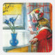 Vintage watercolor em cores brilhantes. Uma garotinha de vestido vermelho e capota olha para um vaso de íris sentado na mesa. Belas artes pelo pintor sueco Carl Larsson.