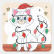 Ilustração de um gato branco vestindo um chapéu de Santa listrado vermelho e branco, envolto em uma corda de luzes de Natal com bolbos vermelhos e verdes, sentados em uma superfície marrom, com um fundo bege claro adornado com estrelas amarelas e formas geométricas, criado com linhas limpas e cores planas.