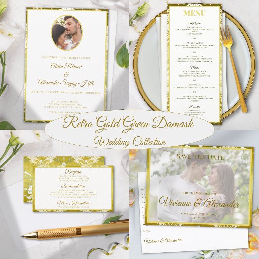 Gold Green Damask Wedding Suite. An elegant damask pattern with an art deco and retro vibe. This wedding suite includes stationery essentials such as formal wedding invitations, "Save the Date" and "Thank you" cards as well as a variety of complementary accessories such as napkins, coasters, table numbers, menu, program boards and even a cornhole game. Personalization options include adding your own photos, names, details, monogram. For customization support, please email me at remidevandesigns@gmail.com RemideVan©