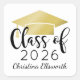 Os adesivos personalizados de graduação apresentam um design personalizado moderno e elegante com o nome do formando, seu ano de classe em um roteiro de caligrafia em preto, e um motivo de boné de formando dourado. Use para destacar envelopes de cartão de lançamento ou favores de festa de formatura!