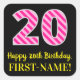 Este design de autocolante quadrado com tema de aniversário alegre apresenta um grande número de "20" com um padrão cor-de-rosa escuro e listras de rosa claro, juntamente com a mensagem "Feliz 20 de Aniversário", e um nome personalizado. O fundo é preto colorido. Cartazes divertidos e personalizados como este podem ser dados como presente de aniversário, ou usados enquanto embrulham presentes, ou talvez usados como decoração de festa de aniversário quando se celebra o aniversário de 20 de alguém. [~Z0000578]