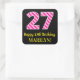 Este design de adesivo quadrado com tema de aniversário alegre apresenta um grande número de "27", com um padrão cor-de-rosa escuro e listras de rosa claro. Também apresenta a mensagem "Feliz 27º aniversário", e um nome personalizado. O fundo é preto colorido. Tímulos divertidos e personalizados como este podem ser dados como presente de aniversário, ou usados enquanto embrulham presentes/presentes, ou talvez usados como decorações de festas de aniversário quando celebram o vigésimo sétimo aniversário de alguém. [~Z0000578]