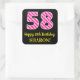 Este alegre design do adesivo quadrado com tema de aniversário apresenta um grande número "58" com um padrão cor-de-rosa escuro e listras de rosa claro, juntamente com a mensagem "Feliz 58º aniversário", e um nome personalizável. O fundo é preto colorido. Bons, alegres, autocolantes personalizados como este podem ser dados como presente de aniversário, ou usados enquanto embrulham presentes, ou talvez usados como decoração de festas de aniversário quando celebram o 58º aniversário de alguém. [~Z0000578]