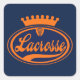 Lacrosse é o Rei. design de sinalização legal e retrô. Oval com letra cursiva da palavra lacrosse com símbolo de bastão de lacrosse. Adornada com coroa vintage. Versão laranja e azul.