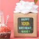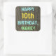 Este design de autocolante com tema de aniversário divertido apresenta uma mensagem como "FELIZ 10º ANIVERSÁRIO,<NAME>!", onde o nome pode ser personalizado. O fundo apresenta um padrão de aparência rústico, castanho e falso em grãos de madeira. O texto de mensagem personalizável apresenta cores como azul, amarelo e verde, e tem uma aparência inspirada pela de letras pintadas e estêncilhadas. Os adesivos como estes poderiam talvez ser dados como presente, ou talvez usados como decorações numa festa de aniversário que está a ser realizada para alguém que comemora o seu décimo aniversário. [~Z0000296]