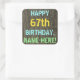 Este design de autocolante de aniversários divertido apresenta uma mensagem como "FELIZ 67º ANIVERSÁRIO, NOME AQUI!", onde o nome pode ser personalizado. O fundo apresenta um padrão de aparência rústico, castanho e falso em grãos de madeira. O texto de mensagem personalizável apresenta cores como azul, amarelo e verde, e tem uma aparência inspirada pela de letras pintadas e estêncilhadas. Vinhetas como estas poderiam talvez ser dadas como presentes, ou talvez usadas como decorações numa festa de aniversário que está a ser realizada para alguém que está a celebrar o seu sessenta e sétimo aniversário. [~Z0000296]
