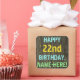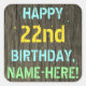 Este design de autocolante de aniversários divertido apresenta uma mensagem como "FELIZ 22º ANIVERSÁRIO, NOME AQUI!", onde o nome pode ser personalizado. O fundo apresenta um padrão de aparência rústico, castanho e falso em grãos de madeira. O texto da mensagem personalizada apresenta cores como azul, amarelo e verde, e tem uma aparência inspirada pela das letras pintadas e estêncilhadas. Vinhetas como estas poderiam talvez ser dadas como um presente, ou talvez usadas como decorações numa festa de aniversário para alguém que comemora o seu vigésimo segundo aniversário. [~Z0000296]