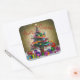 Pau Quadrado Feliz de Natal - Uma cena de Natal surrealista com uma árvore de Natal caprichosa, decorada em cores vibrantes. Ao redor da árvore, com uma variedade de presentes envoltos em papel brilhante, uma vez que uma queda de neve suave adiciona uma atmosfera festiva, incluindo um feliz "Feliz Natal" no fundo. Pode ser comprado como adesivo quadrado.