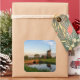 Um adesivo fotográfico de souvenir quadrado de um moinho de vento próximo a uma pequena vala com uma ponte na borda de um grande campo no campo holandês ao pôr do sol em Aarlanderveen, Países Baixos.