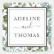 Os adesivos elegantes para favoritos de casamento são projetados com o estilo orgânico moderno, combinando um quadro quadrado geométrico com folhagem verde botânica e bela tipografia. A design de cor-de-água verde inclui eucalipto, folhas e galhos de eucalipto de prata em tons vermelhos macios de menta, verde, azeitona e verde-azul-acastanhado. Perfeito para um evento de primavera ou verão. O texto do monograma do casamento preto pode ser personalizado com os nomes da noiva e do noivo.