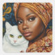 Um retrato cativante de uma jovem africana em um embrulho de cabeça de padrão vibrante, segurando suavemente um gato branco, colocado contra um fundo botânico exuberante.