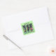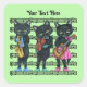 Este adesivo quadrado tem três gatos pretos vestindo arcos e gravatas cor-de-rosa, azuis e verdes tocando instrumentos musicais incluindo violino, guitarra e saxofone em uma folha de notas de música preta sobre fundo verde claro.