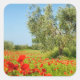Um adesivo fotográfico com uma oliveira antiga num cheio de papoila vibrante vermelho num campo de papoila numa paisagem na Toscana, Itália.
