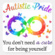 Símbolo infinito colorido do Orgulho Autista e a mensagem de "Você não precisa de uma cura para ser você mesmo" com belas borboletas, corações e flores. É um presente excelente para celebrar o Dia do Orgulho Autista no dia 18 de junho a cada ano.