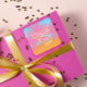 O adesivo favorito da festa "Obrigado" rosa é uma diversão para uma festa de solteira com a noiva ser o nome debaixo. O fundo é colorido com palmeiras azuis, amarelas e cor-de-rosa.