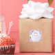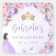 Estes encantadores adesivos do partido quinceañera apresentam uma borda de roxo lilás e rosas rosa pinceladas em um fundo de aquarela roxo. Uma tiara dourada, uma menina de cabelo escuro em um vestido princesa roxo e pequenas borboletas roxas decoram o texto. O nome do convidado de honra aparece no elegante script de escrita manual roxo, com o texto restante na fonte sans serif roxa.
