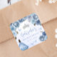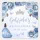 Estes encantadores adesivos do partido quinceañera apresentam uma borda de rosas azuis sobre um fundo azul claro de aquarela. Uma tiara prateada, uma menina de cabelo escuro em um vestido de princesa azul e pequenas borboletas azuis decoram o texto. O nome do convidado de honra aparece no elegante script de escrita manual azul, com o texto restante na fonte azul sans serif.