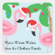 Ataque de Natal com pássaros flamingos rosados vestindo chapéus de Papai Noel. Ornamentos e luzes de férias decoram as palmeiras. Mande alegria de inverno quente para seus amigos e família com essas etiquetas divertidas e caprichosas. Copyright Bendel Creative Design LLC Todos os direitos reservados.