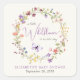 Elegante adesivo de chá de menina de creme leve para seus convites, favoritos para festas e cartas de agradecimento com "uma pequena flor silvestre está a caminho" na tipografia moderna de cinzas e um roteiro de lavanda na moda, uma faixa de aquarela inspirada no livro de flores silvestres roxas, rosa, pêssego e amarelas, e uma borboleta roxa. Personalize o nome da mãe e a data do chá em simples tipografia de lavandas e cinzas.
