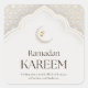 A serene Ramadan digital design featuring a white crescent moon adorned with golden geometric patterns, and two glowing golden lanterns hanging gracefully. Elegant dark brown serif typography highlights “Ramadan Kareem” with a warm message of peace, reflection, and kindness below. Set against a soft cream background with subtle gold accents and Islamic geometric motifs, this artwork embodies spirituality, celebration, and festive harmony for the sacred month.