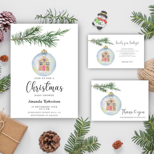 Ramo de inverno com um brinquedo. Convite de baby shower em aquarela com ramo de pinheiro de Natal com bolas de Ano Novo dentro de uma casa de gengibre. Itens correspondentes disponíveis.