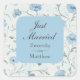 Celebrar o amor mais doce. Este design de casamento "recem casados" floresce com flores elegantes, botânicos de cor azul-d-água poeirentos e flores de primavera. Perfeito para comemorações de verão rústicas, recepções de chiques de vintage, ou casamentos românticos de cottagecore, adiciona encanto sincero a favores, obrigados e seguidores. Um detalhe de eterno que captura a alegria do seu novo começo.