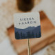 Estes retiros para as selas de envelopes de casamento das montanhas são perfeitos para um casamento moderno. O design apresenta uma serena cordilheira azul-aquática com uma floresta de árvores verdes em primeiro plano. Personalize o rótulo com os nomes da noiva e do noivo.