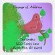 Um pequeno pinto vermelho giro sentado num galho de árvore com uma folha no bico. Personalize com todas as suas informações conforme desejado.