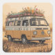 This retro camper van sticker features a classic hippie van decorated with flowers and peace signs in warm earthy tones.