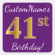 Este simples design de autocolante de aniversário apresenta uma mensagem como "CustomName’s 41rua Birthday!", com a "41ruas" a ter uma aparência de cor falsa/imitada inspirada em ouro, num fundo cor roxo. O nome pode ser personalizado. Os adesivos como estes podem talvez ser um presente para alguém que comemora o seu quarenta primeiro aniversário, ou talvez possam ser usados como decorações numa festa de aniversário. [~Z0000246]