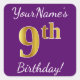 Adesivo Quadrado Roxo, Faux Dourado 9º Aniversário + Nome Personali
