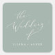 Estas delicadas selagens verdes de envelopes são perfeitas para um casamento de primavera ou verão. A design romântica minimalista apresenta uma caligrafia branca elegante e elegante sobre um fundo verde empoeirado com um aspecto simples e limpo. Personalize o rótulo com os nomes da noiva e do noivo.