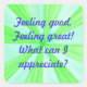Aproveite a leitura e/ou compartilhamento dessa afirmação de apreço, "Sentindo-se bem. Sentir excelente! O que posso apreciar?" num fundo geométrico de cor verde e azul, impresso em vários produtos.