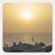 Vista através do complexo de bungalow até o mar com um barco à vela ao pôr do sol, em Costa Adeje, Espanha, Tenerife