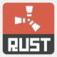 Símbolo RUST em Clear (Limpar) em um fundo vermelho, RUST branco em preto.