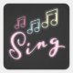 A palavra SING e três notas musicais são colocadas em neon contra um fundo de concreto preto.