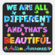 Citação inspiradora de "Somos Todos DIFERENTES E Isso é LINDO" com quebra-cabeça autistas únicos, e borboletas coloridas voando em segundo plano para apoiar e defender a consciência do autismo.