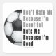 Arte de futebol não me odeia porque sou Boas t-shirts, presentes e acessórios criados pelo ITD Sports Center apresentam a nossa obra de arte original de meia bola de futebol preto e branco no lado esquerdo com as palavras em preto e branco à direita, Não me odeie porque sou Bonita, Odeio-me Porque sou Boa. Nossos artigos esportivos divertidos e competitivos são presentes de excelente para amantes de futebol, amantes de futebol, jogadores de futebol, estrelas de futebol, treinadores de futebol, atletas e amantes de esportes de todas as idades. É tudo divertido e jogos na Imagine isso! Centro de Esporte design!