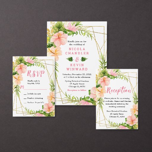 This beautiful and elegant wedding thank you sticker features watercolor pink and orange hibiscus flowers and foliage on a gold geometric frame. The text combines handwritten script and serif fonts for a stylish and modern look. This is perfect for a summer tropical wedding.