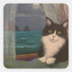 Tuxedo cat em um cobertor macio em frente a uma janela com cortinas e a lua noturna lá fora