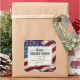 O adesivo personalizado de casamento Patriótico dos EUA Flag retrata a bandeira americana vermelha, branca e azul Estrelas e Stripes. Apresenta a Bíblia cristã Verse de 1 Corinthians 13:8, "O amor nunca falha." Personalizar com nomes de casais e data.