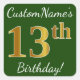 Adesivo Quadrado Verde, Faux Dourado 13 Aniversário + Nome Personal