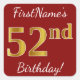 Este simples design de aniversário apresenta uma mensagem como "52º Aniversário do Primeiro Nome!", com o "52º" a ter uma aparência falsa e imitada de cor inspirada em ouro, num fundo de cor vermelha. O nome pode ser personalizado. Os adesivos como estes poderiam talvez ser um presente para alguém que comemora o seu cinquenta segundo aniversário, ou talvez pudessem ser usados como decorações numa festa de aniversário. [~Z0000245]