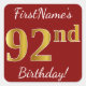 Este simples design de aniversário apresenta uma mensagem como "O 92º Aniversário do Primeiro Nome!", com o "92º" a ter uma aparência falsa e imitada de cor inspirada em ouro, num fundo de cor vermelha. O nome pode ser personalizado. Os adesivos como estes podem talvez ser um presente para alguém que comemora o seu 90º aniversário, ou talvez possam ser usados como decorações numa festa de aniversário. [~Z0000245]