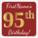 Este simples design de aniversário apresenta uma mensagem como "O 95.º Aniversário do Primeiro Nome!", com o "95.º" a ter uma aparência falsa e imitada de cor inspirada em ouro, num fundo de cor vermelha. O nome pode ser personalizado. Os adesivos como estes poderiam talvez ser um presente para alguém que comemora o seu 90.º aniversário, ou talvez pudessem ser usados como decorações numa festa de aniversário. [~Z0000245]