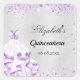 Elegante, glamouroso e feminino para uma Quinceañera, 15 festa de aniversário. Um fundo metálico de aspecto fino prateado decorado com poeira brilhante púrpura. Personalize e adicione um nome e data. O texto: Quinceañera e o nome são escritos com scripts de estilo modernos e escritos.