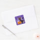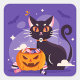 Um gato preto branco com olhos brilhantes senta-se ao lado de uma abóbora cheia de doces coloridos. O gato tem uma expressão brincalhona contra um fundo roxo e assustador com morcegos e nuvens.