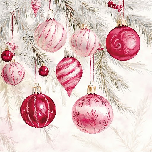 Nossos adoráveis ornamentos vintage são cor-de-rosa com realces vermelhos e mauve e contraste com branco. Eles pendem de galhos de uma árvore de Natal nesta adorável aquarela. Mostrámos este autocolante como a forma quadrada, mas também parece bom na forma redonda, se preferirem.