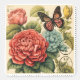 Belos Vinhetas Românticos. Flores vermelhas e azuis e uma borboleta em um selo retrô. Vintage Art.