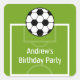 Tampões de festa de aniversário com ilustração de uma bola de futebol e de um campo de futebol. Personalize o texto. Procure por convites de aniversário na Paperie de Jill.